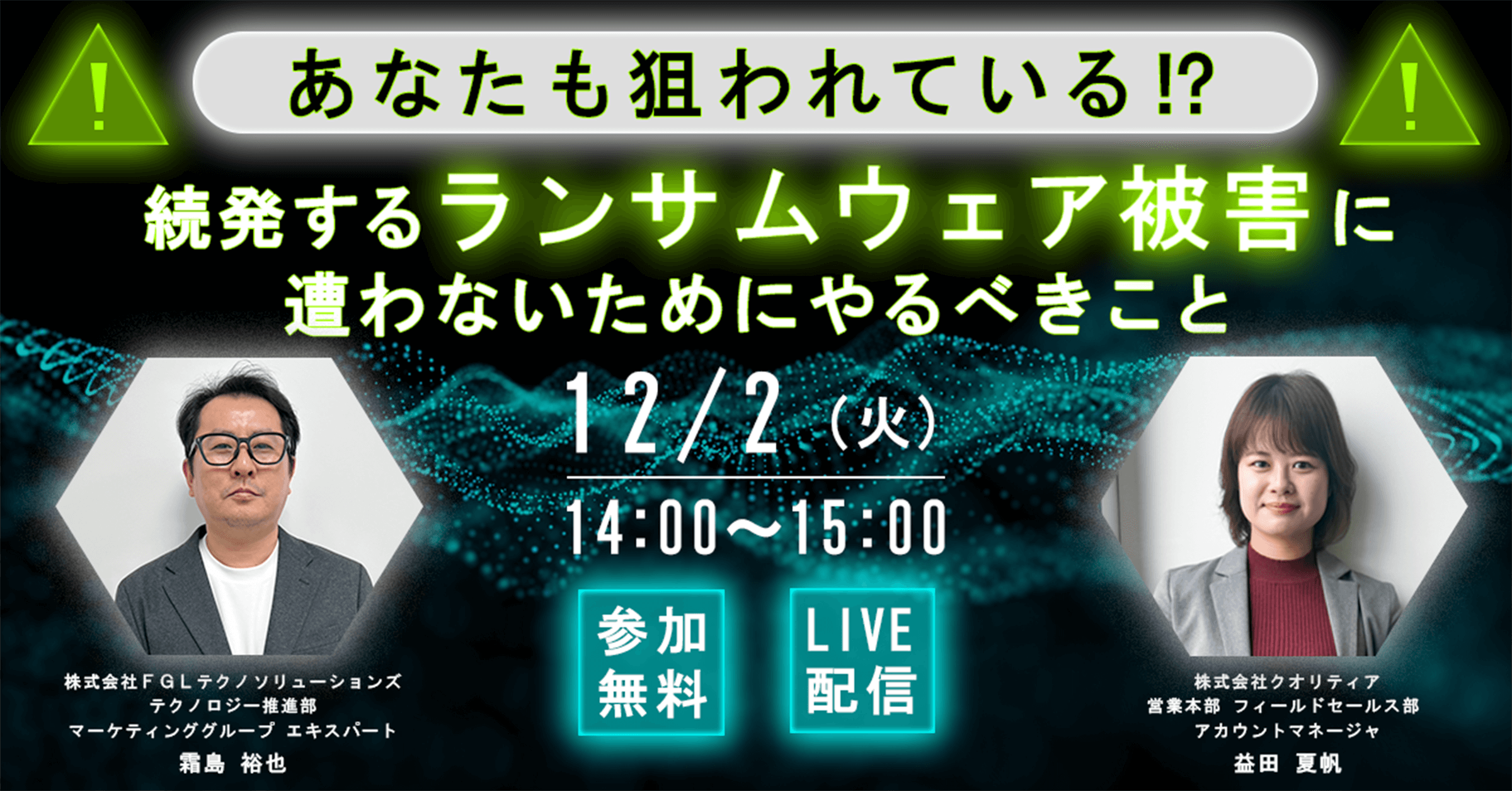 株式会社クオリティア(本社:東京都中央区、代表取締役:松田 賢、以下「クオリティア」)は、株式会社FGLテクノソリューションズ(本社:東京都江東区、代表取締役社長:湯浅 敏之、以下「FGLテクノソリューションズ」)と共に12月2日(火)に「あなたも狙われている!? 続発するランサムウェア被害に遭わないためにやるべきこと」と題したウェビナーを開催いたします。